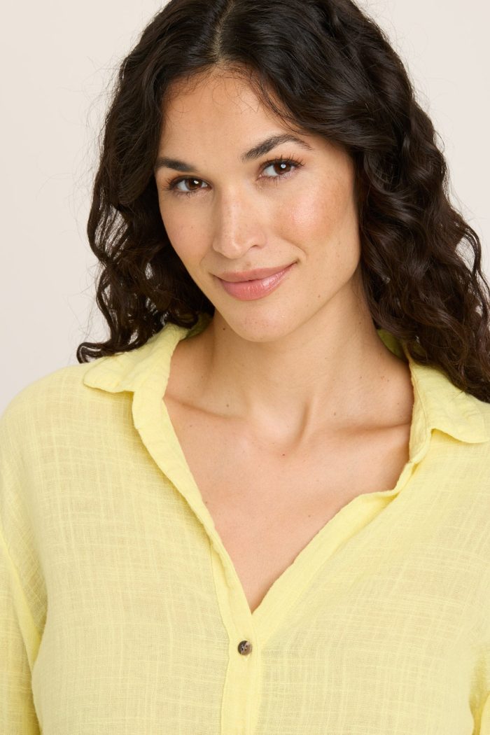 This gauze button-up blouse is great for layering. Features tabbed sleeve for easy rolling, curved hemline, and a box pleat on back.